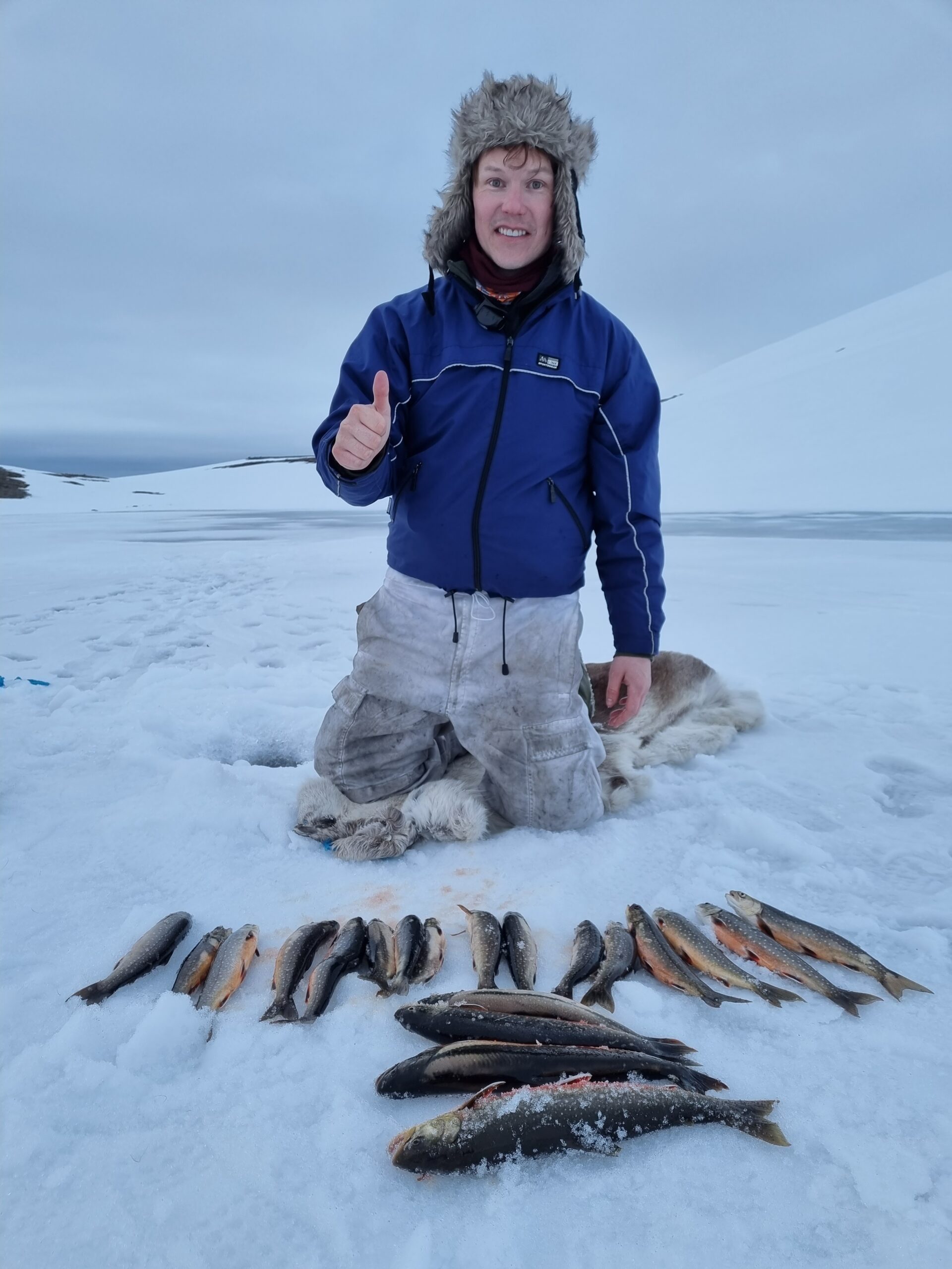 Vi følger den historiske postruta over vidda. Terrenget er åpent og utsikten vid. Målet for dagen er området ved Iešjávri, Finnmarks største innsjø. Her kommer vi til å prøve å få til en del isfiske. ørret her kan bli over 10 kilo. Sette garn under isen.